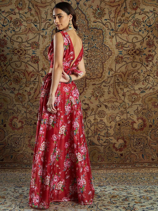 Sassafras Women's Red Chanderi Floral Crop Top With Skirt